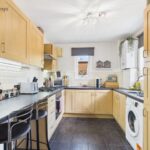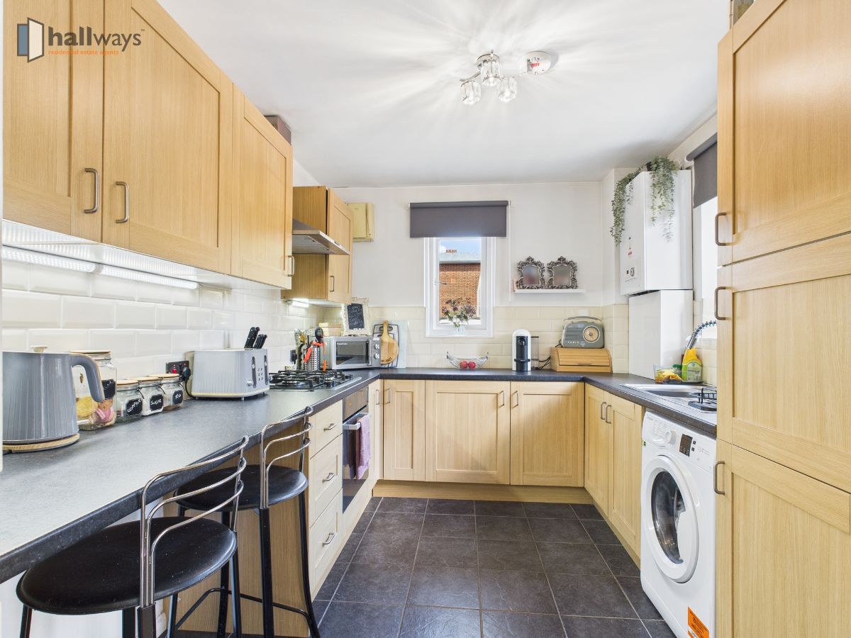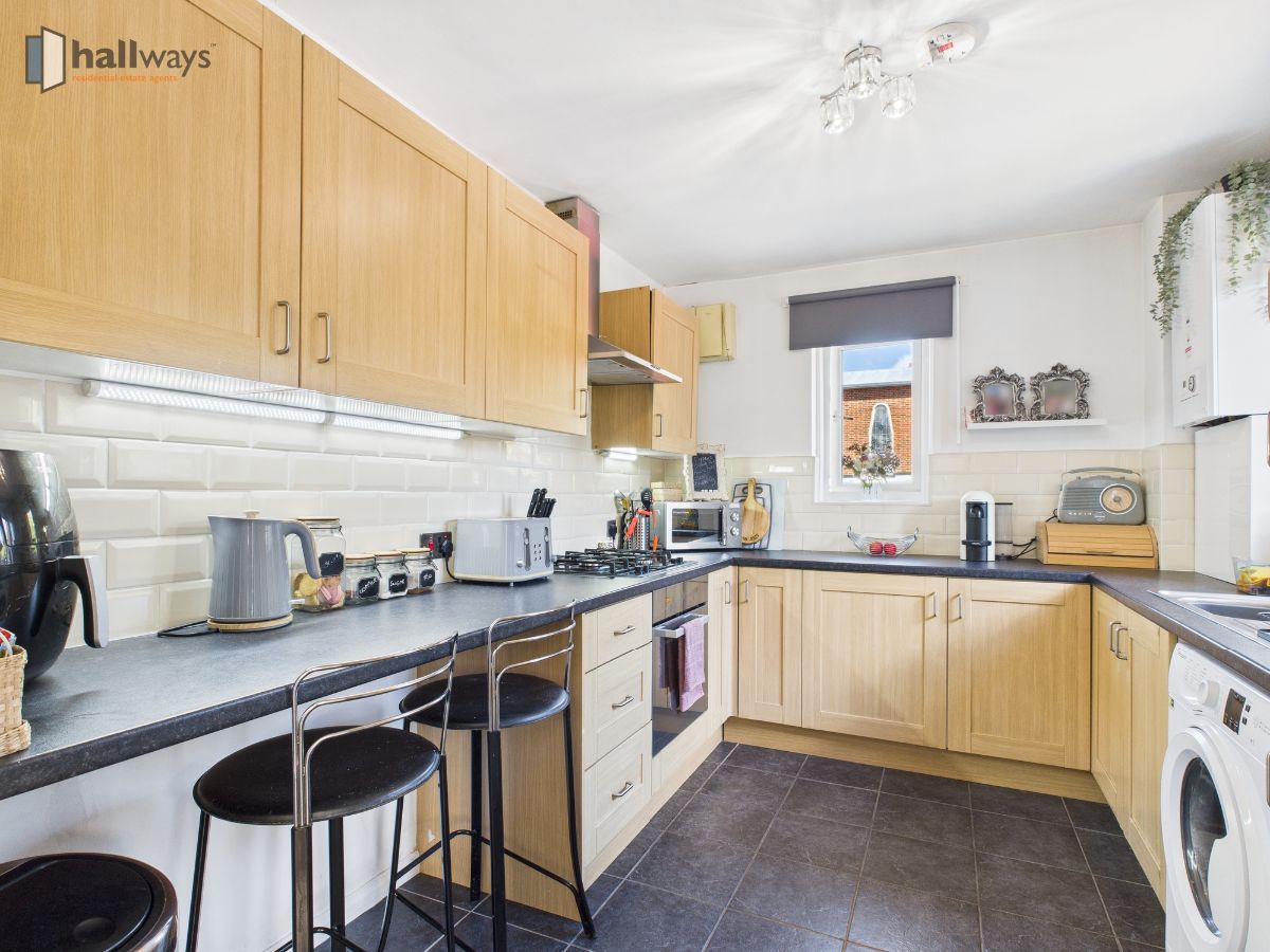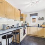 The modern fitted kitchen provides ample storage and workspace, with space for appliances and a practical layout.
