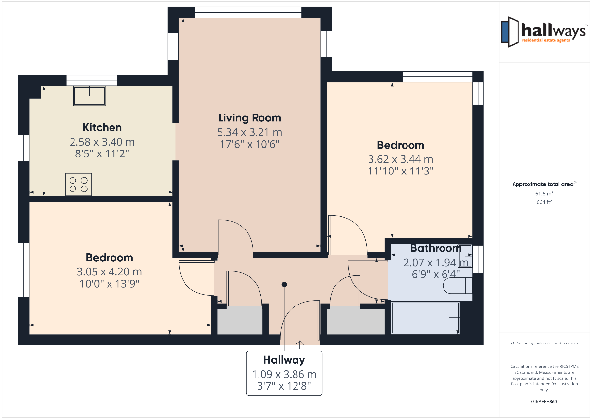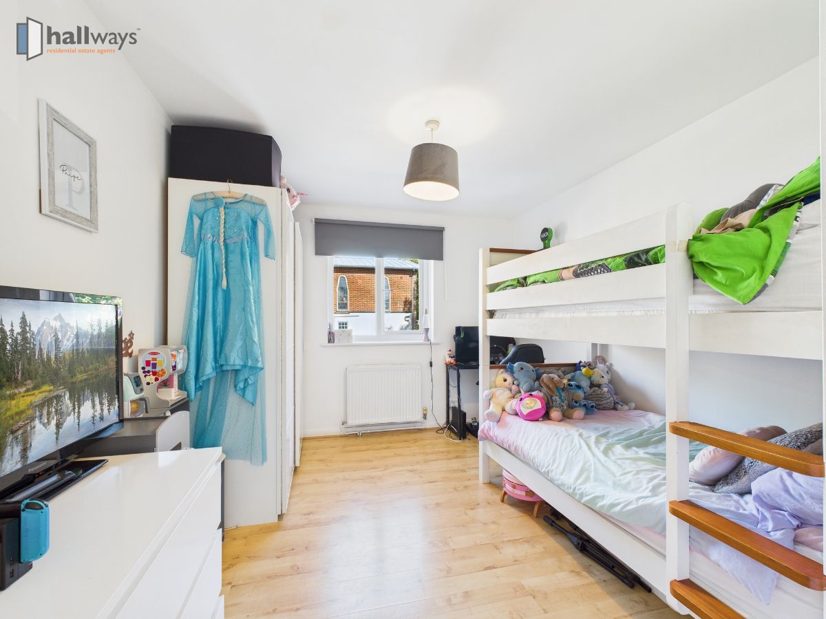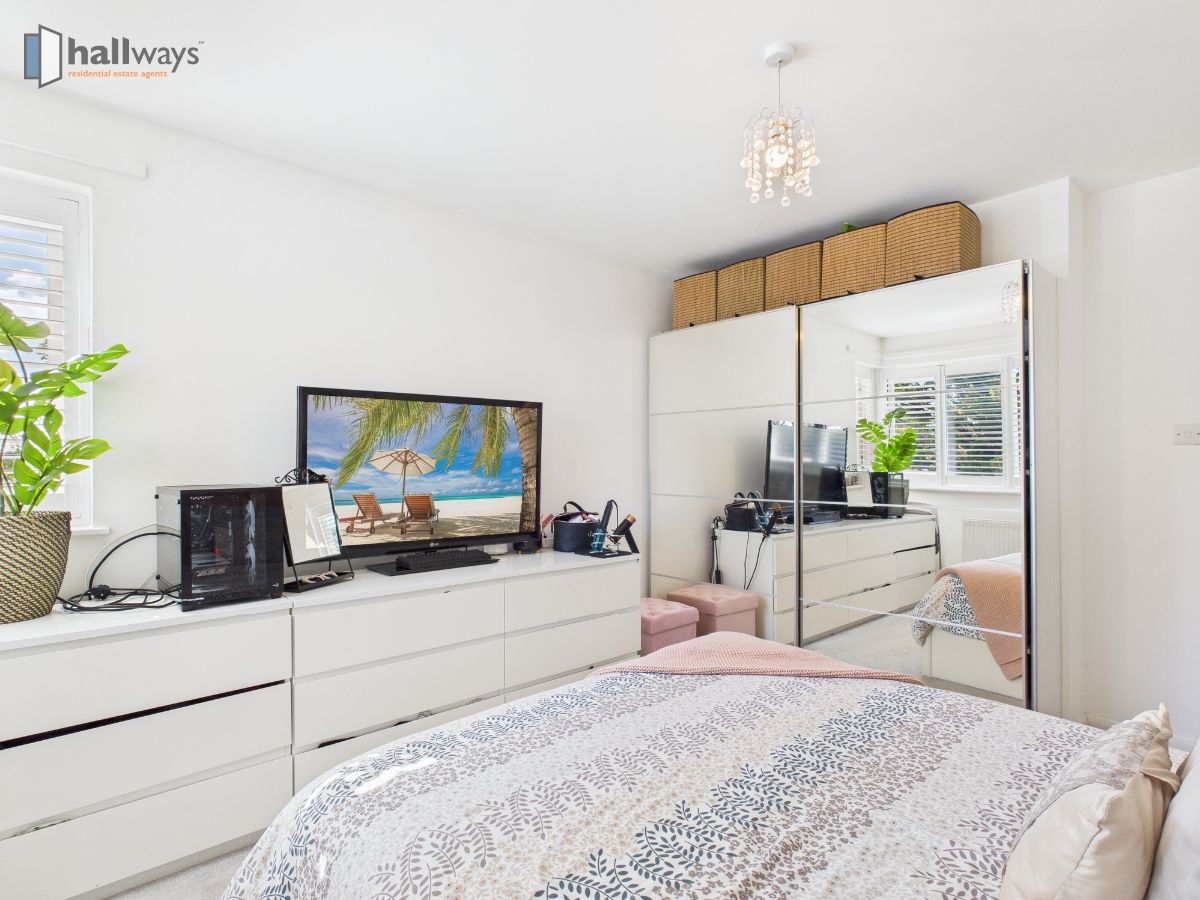 There are two double bedrooms, both neutrally decorated and well-proportioned, with the larger bedroom offering excellent space for wardrobes and storage. A fresh, fully tiled bathroom with a bath and overhead shower completes the home.