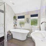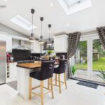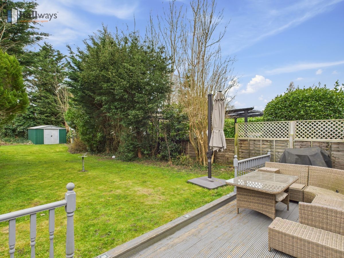 The welcoming hallway leads to a generous living room, with an elegant arch feature, which is the perfect space for relaxation. A separate dining room with a fireplace flows seamlessly into a stylish modern kitchen, complete with an island, ample storage, and beautiful wooden countertops. A separate utility room adds extra convenience, while the adjoining study provides a quiet space for work or reading.