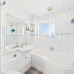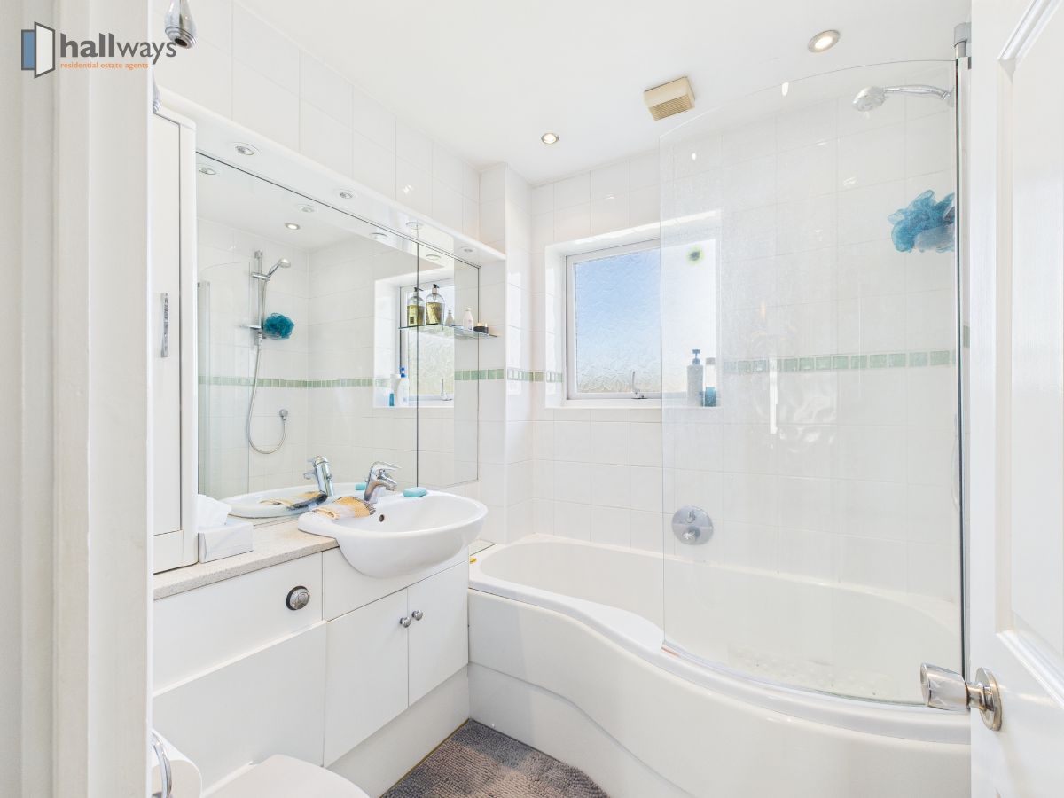 The family bathroom is contemporary in design and features a three-piece suite, including a bath with overhead shower, stylish fittings, and a clean, modern finish.
